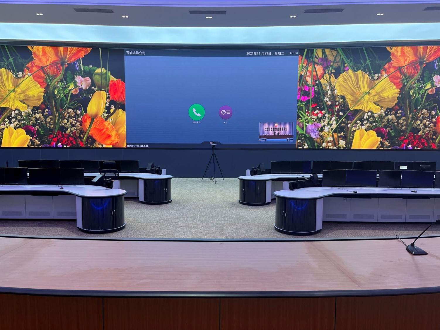 中國石油運輸公司調度中心項目位于北京順義和新疆烏魯木齊兩地,兩地調度中心各建1套1.56mm的LED監控大屏,并重點對兩地視頻會議功能進行升級,由原來模擬視頻會議終端升級為高清終端,實現雙路高清攝像機信號的實時切換及雙流顯示。保證兩地調度中心會場互聯互通,實現視頻交流,通過集團M